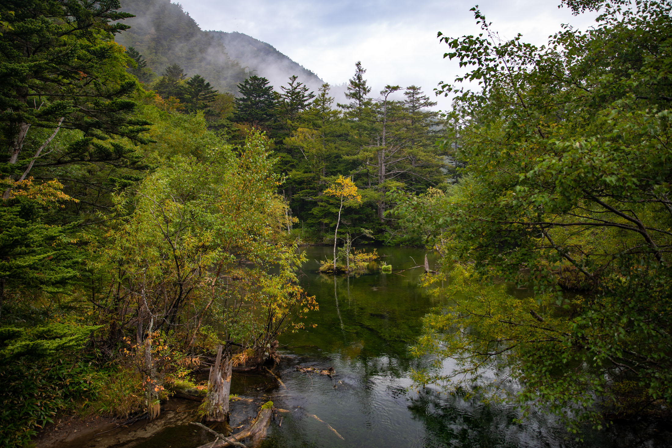 Majestic autumn peaks tower above a vibrant, mist-shrouded forest in a breathtaking mountainscape.