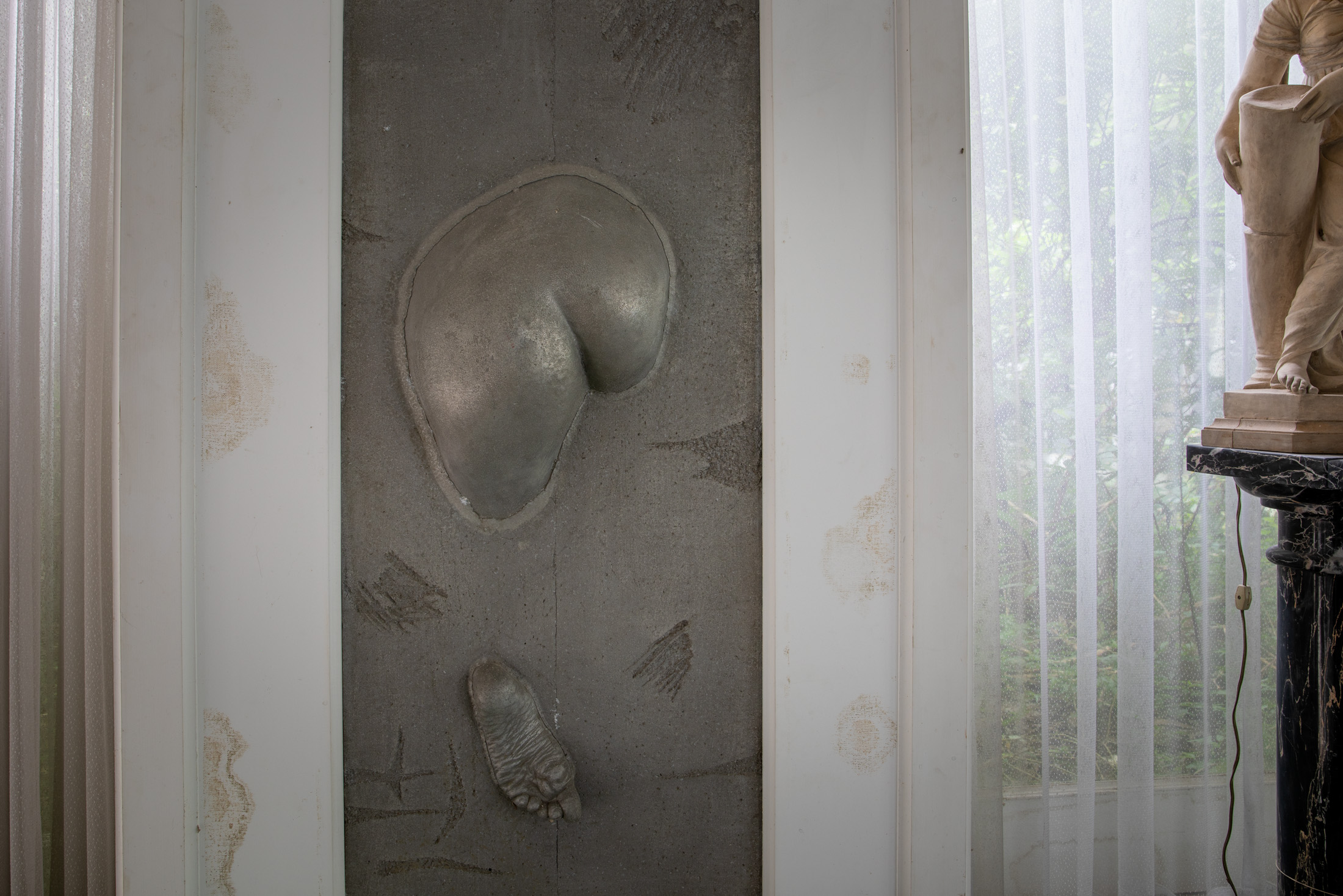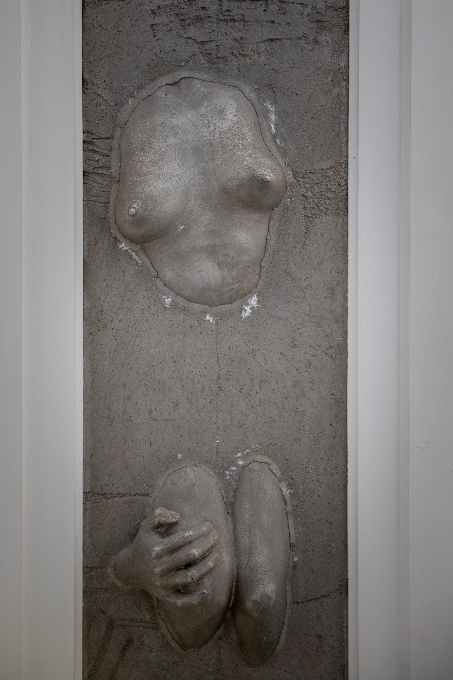 Distorted human sculpture emerges from Marugen estate wall, creating an unsettling contrast.