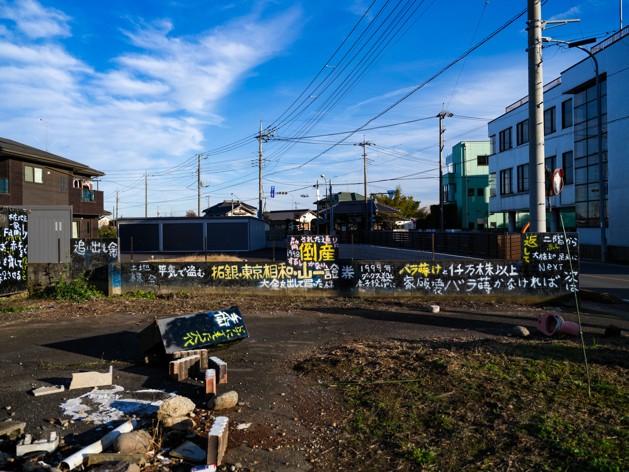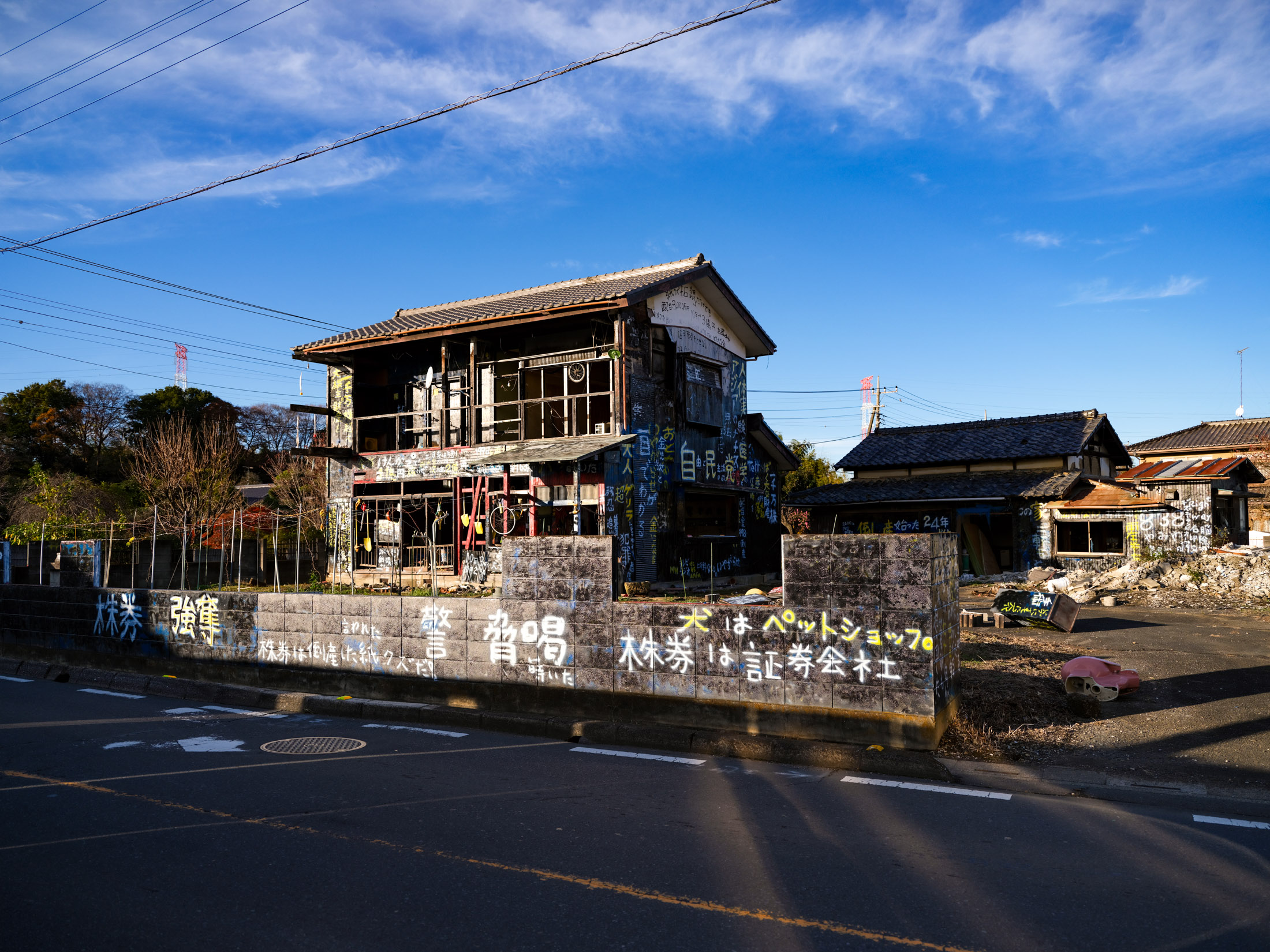 Black-painted house covered in Japanese graffiti stands beside an empty dirt lot under power lines in a quiet neighborhood.