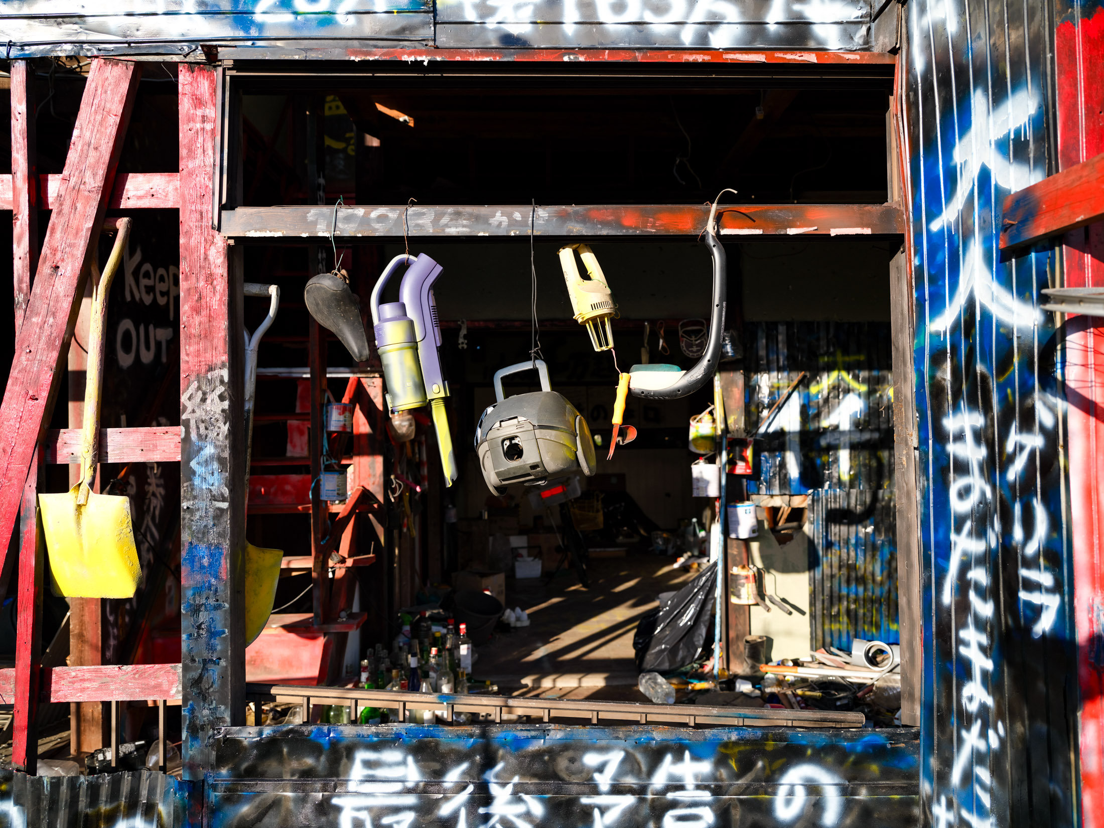 Abandoned wooden shack with graffiti, cluttered buckets and tools, and a rusted bicycle wheel hanging by the open entrance.