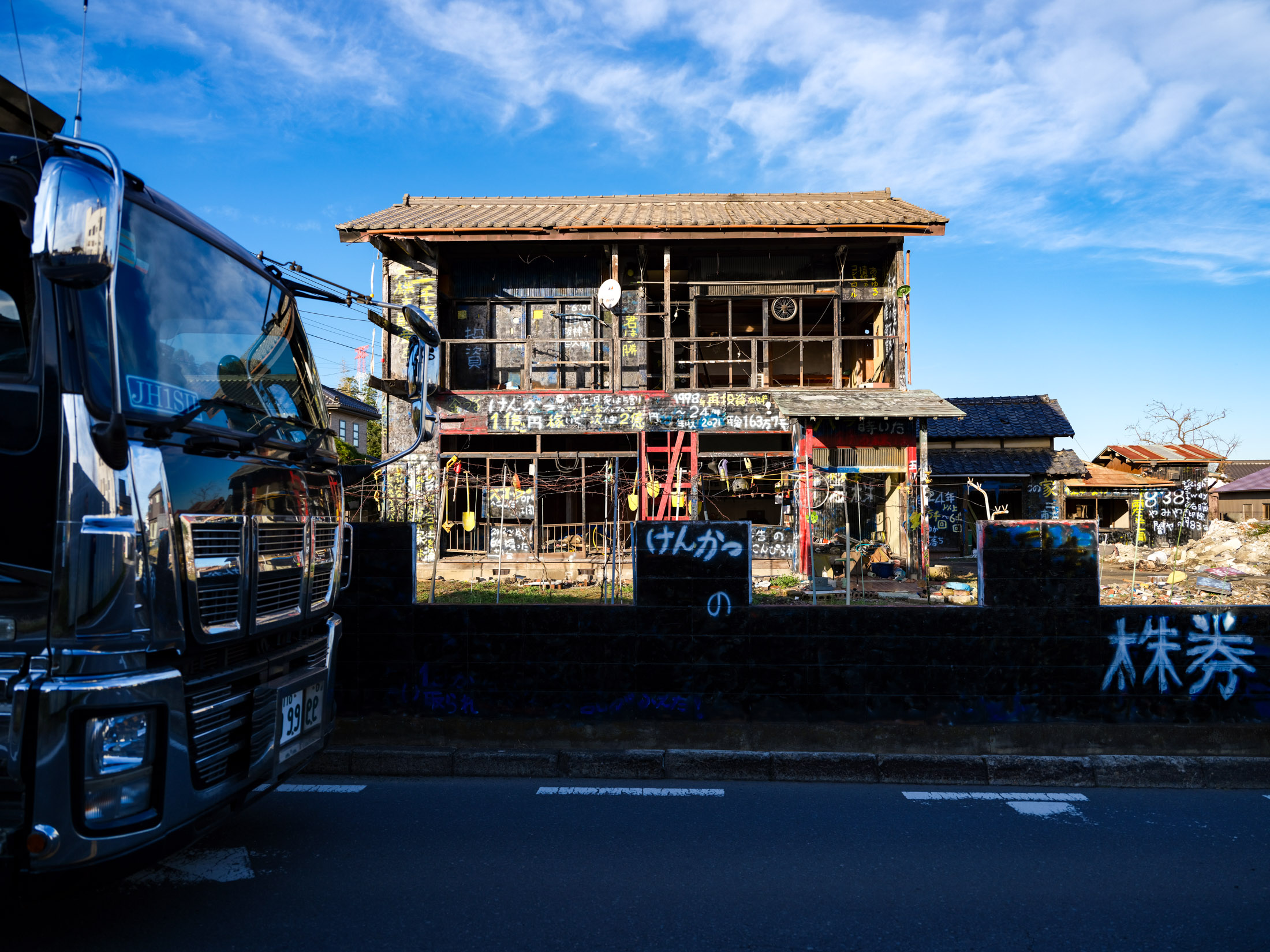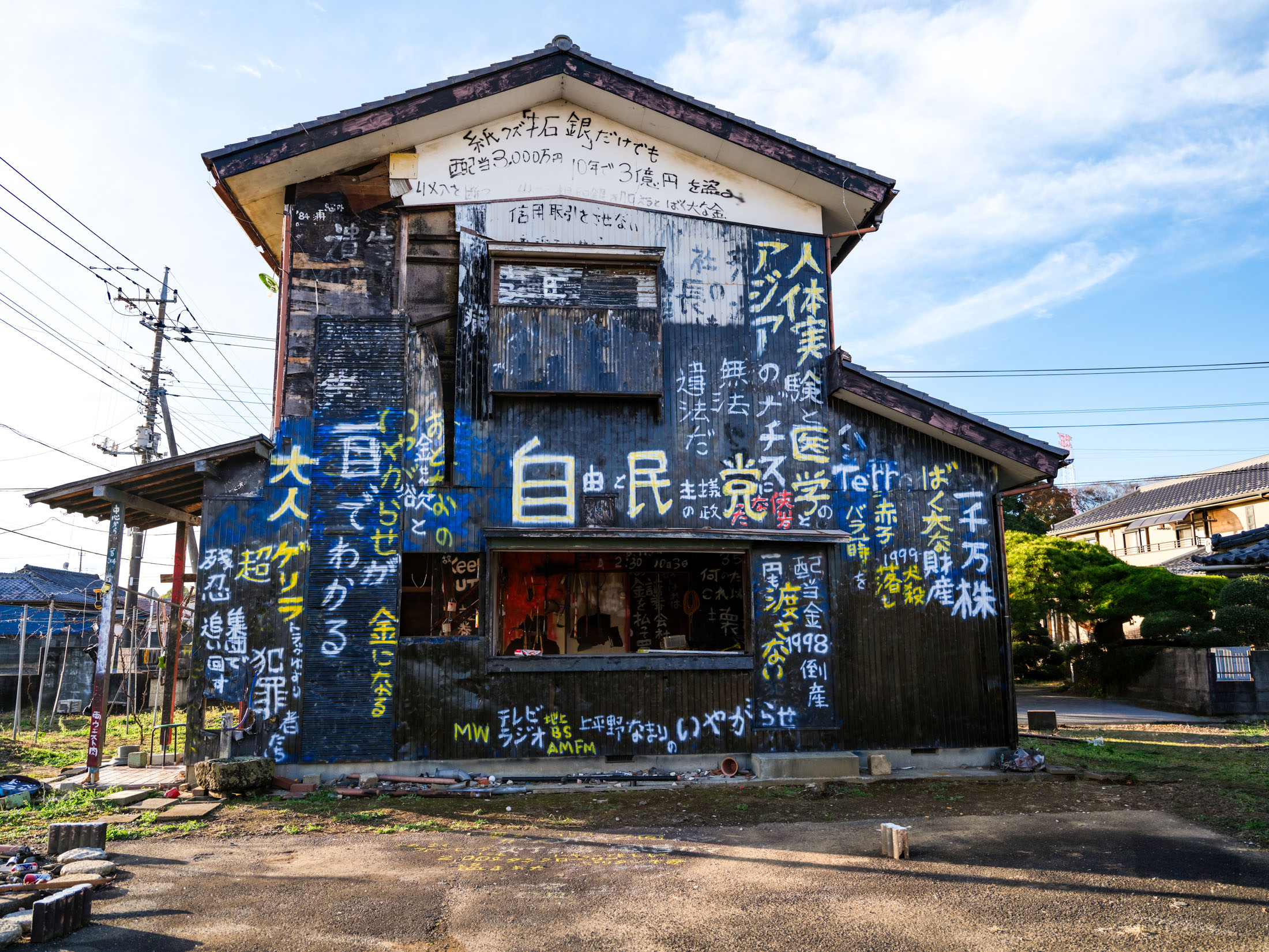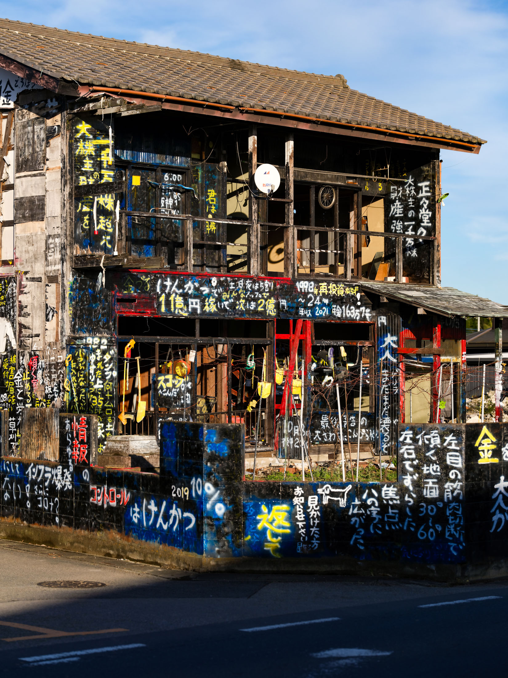 Weathered black house covered in Japanese graffiti and colorful markings, with a red beam and concrete wall under a clear blue sky.