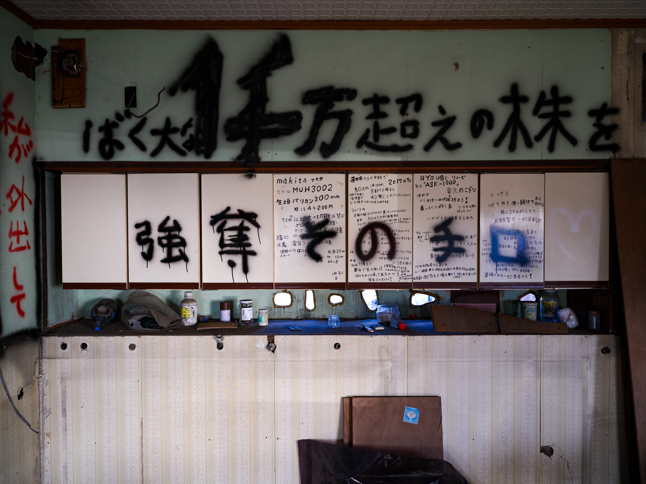 Abandoned Japanese room with bold black calligraphy on wall panels, taped notices, and dusty cabinets below.