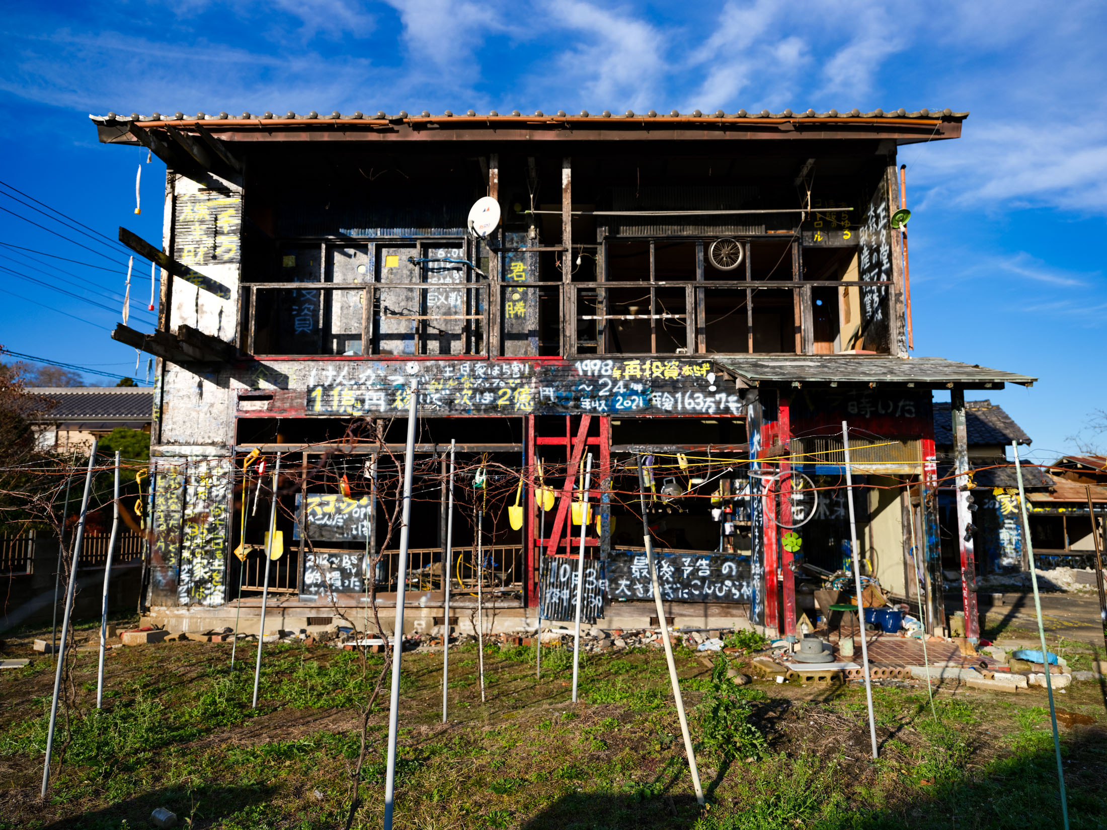 Graffiti-covered black two-story house with a bright red ladder, exposed beams, and a satellite dish under a clear blue sky.
