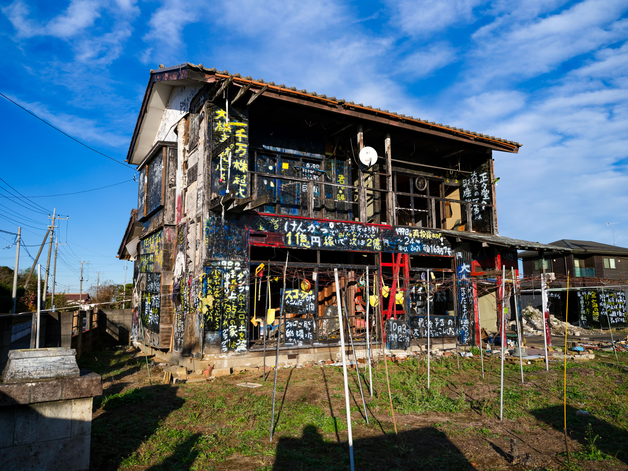 Weathered black house covered in handwritten symbols and numbers stands in a rural yard under a bright blue sky.