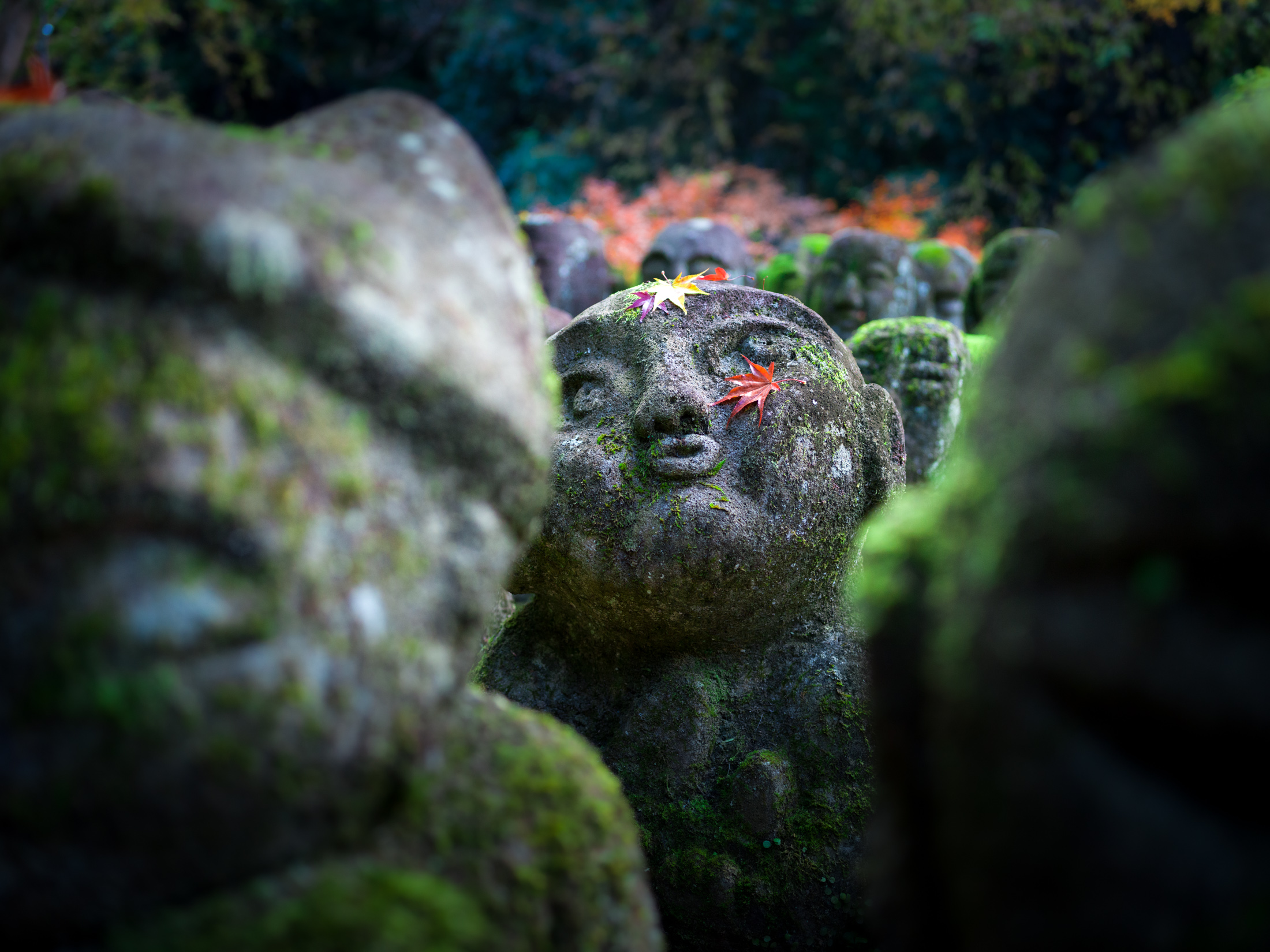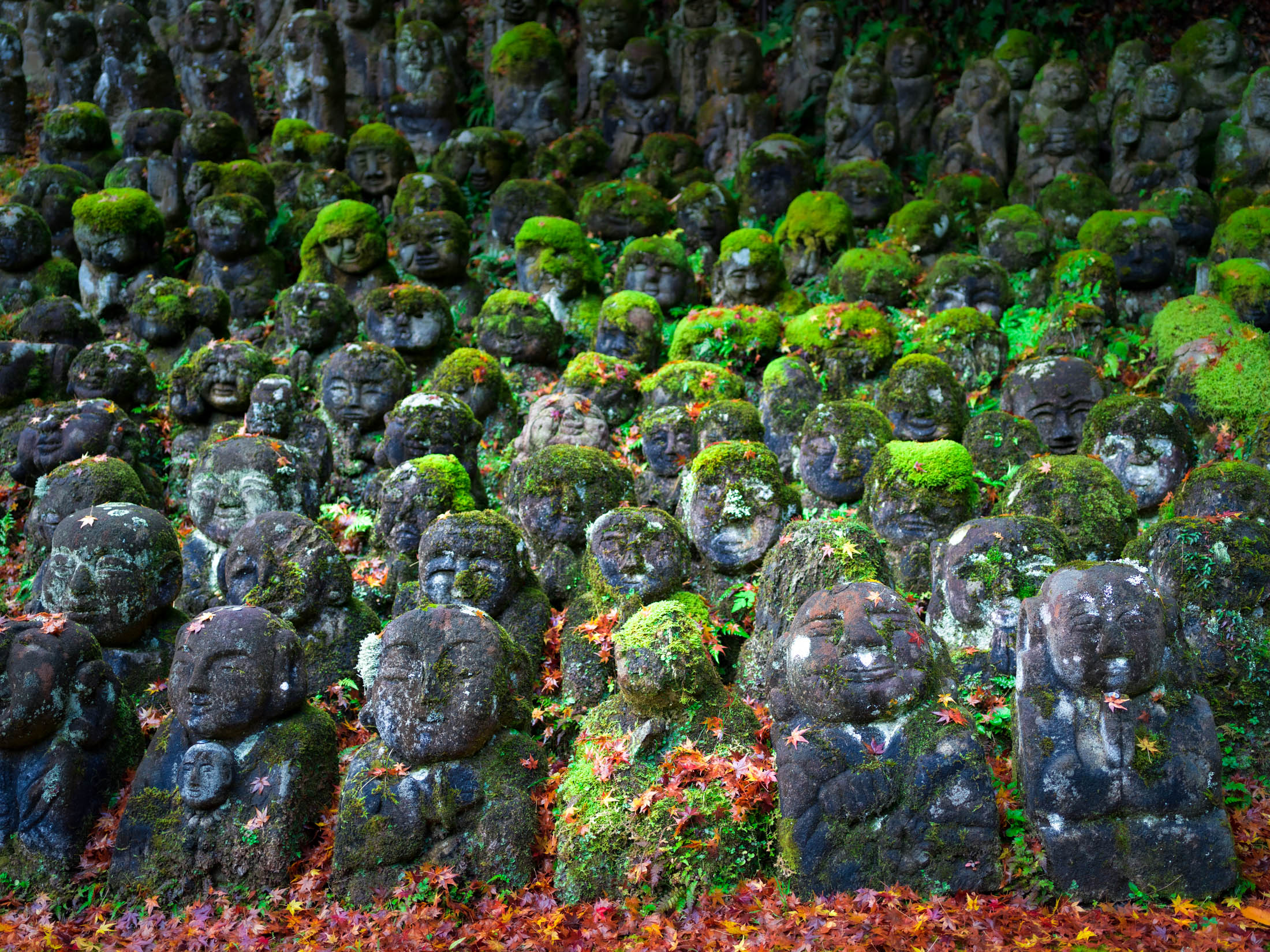 Moss-covered stone Buddha statues line the forested slope at Otagi Nenbutsu-ji Temple in Kyoto, accented by fallen autumn leaves.