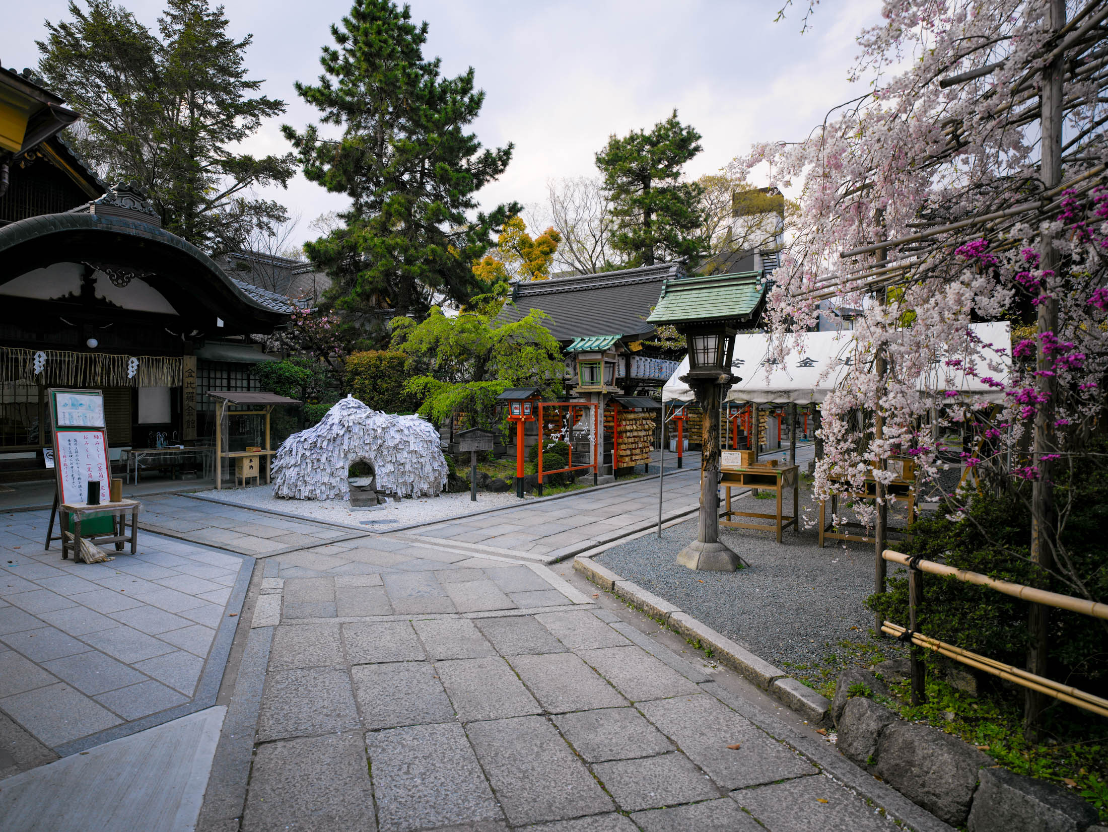 Quiet Gion shrine courtyard in Kyoto with a stone path, vermilion torii gate, wooden buildings, and blooming cherry blossoms.