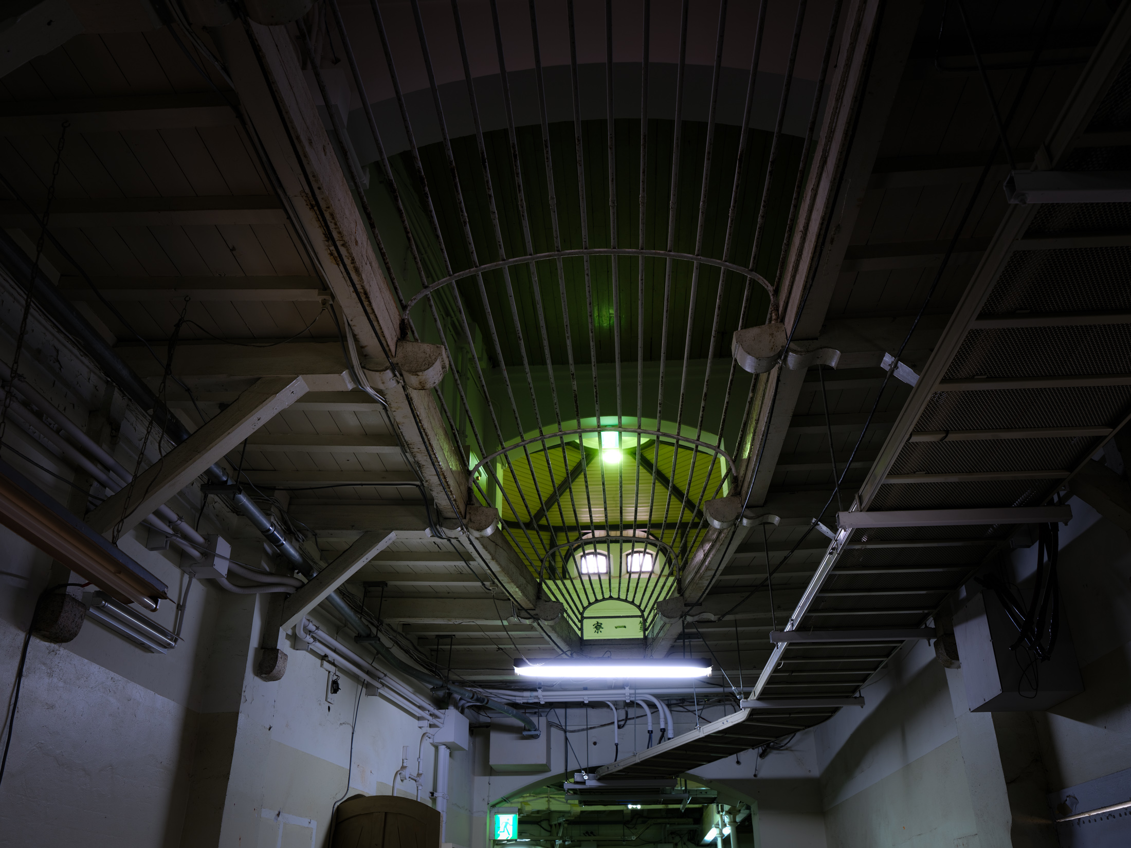 Green caged ceiling light and exposed pipes in a dim corridor at Nara Prison, Japan.