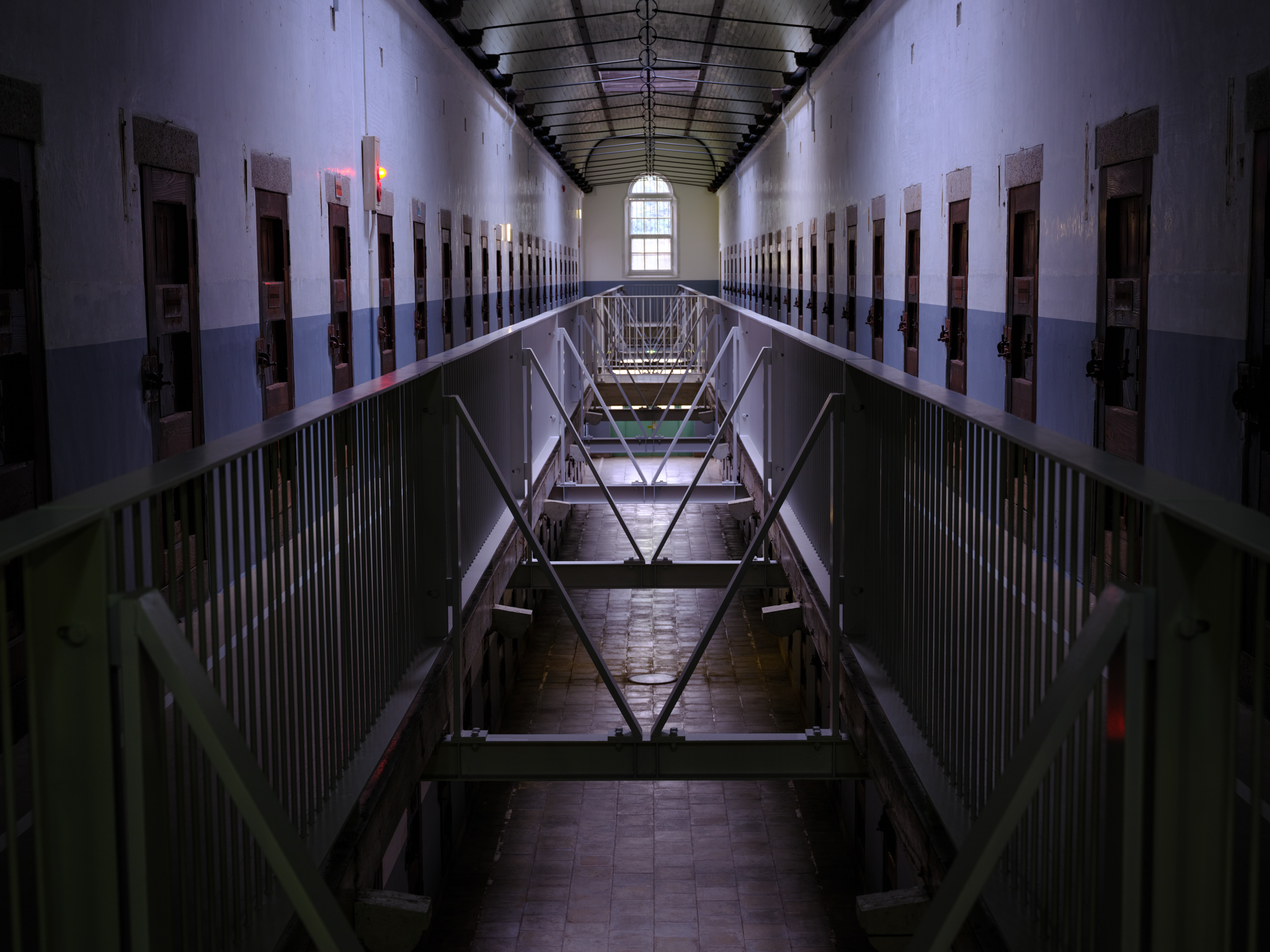 Symmetrical cell block corridor inside Nara Prison, with barred doors and multi-level walkways leading to an arched window.