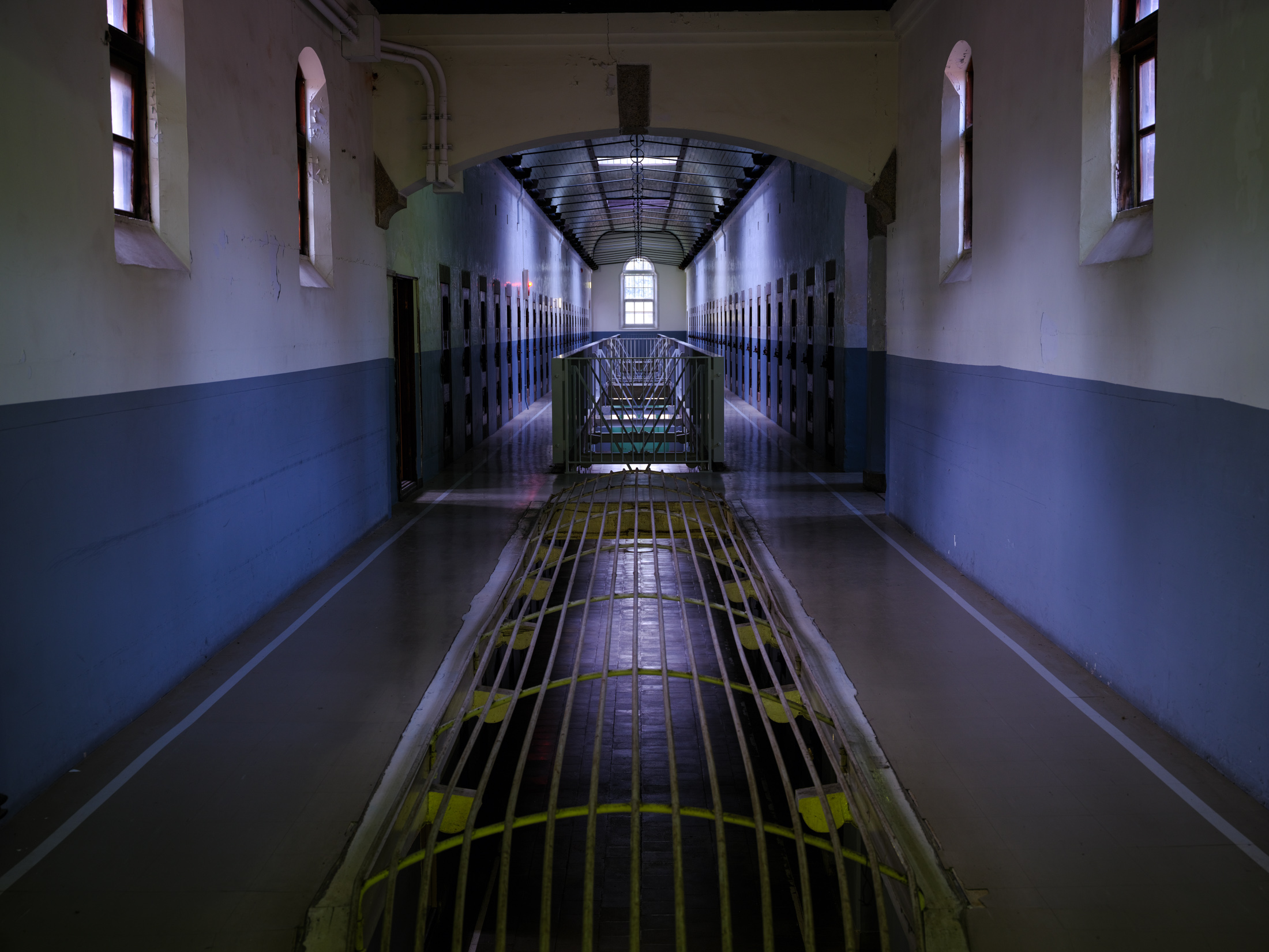 Symmetrical corridor inside Nara Prison with arched windows, green beams, and soft natural light fading into the distance.