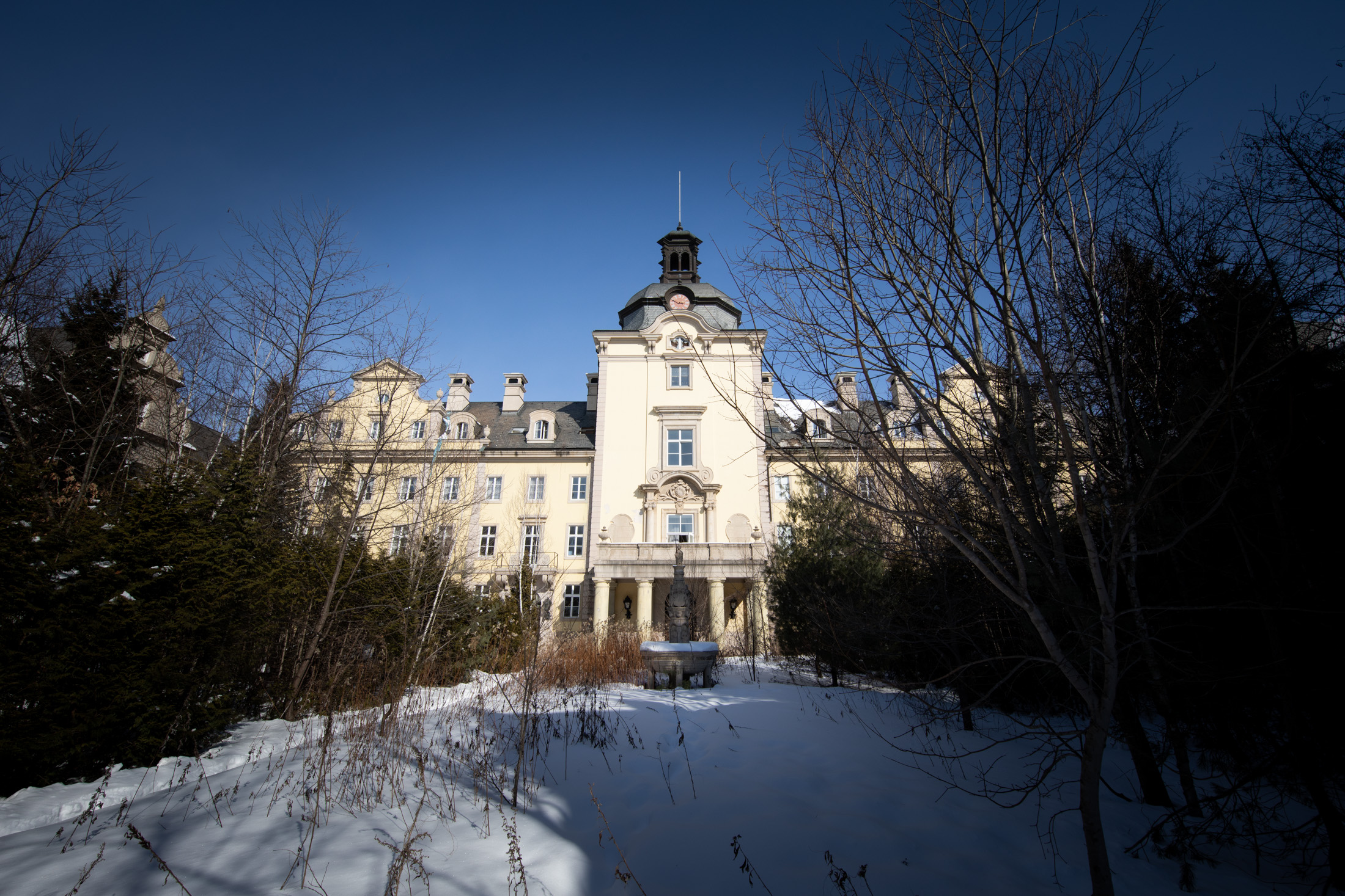 Ornate castle edifice in an abandoned winter wonderland theme park.