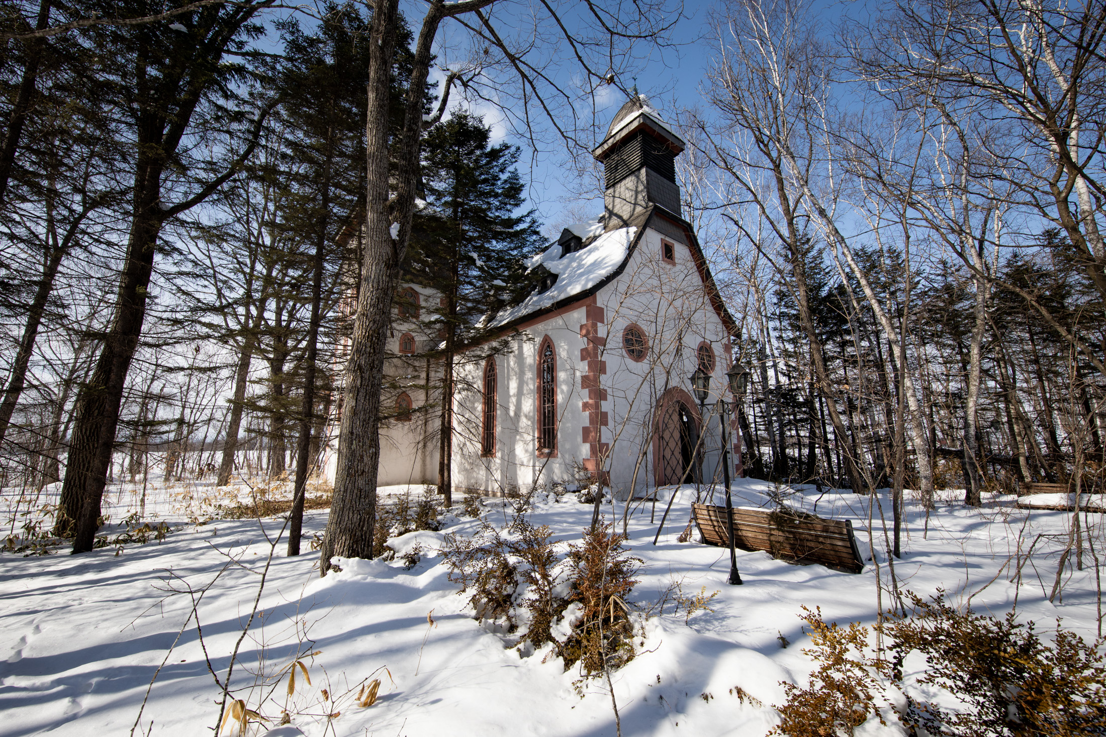 Haunting beauty: Abandoned winter theme park with snow-blanketed church structure.