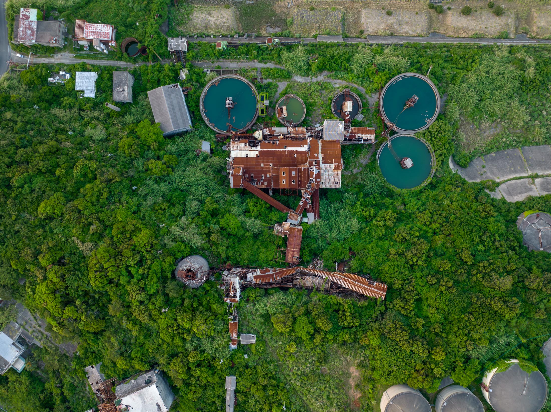 Aerial view of a wastewater treatment plant seamlessly integrated into a lush forest landscape.