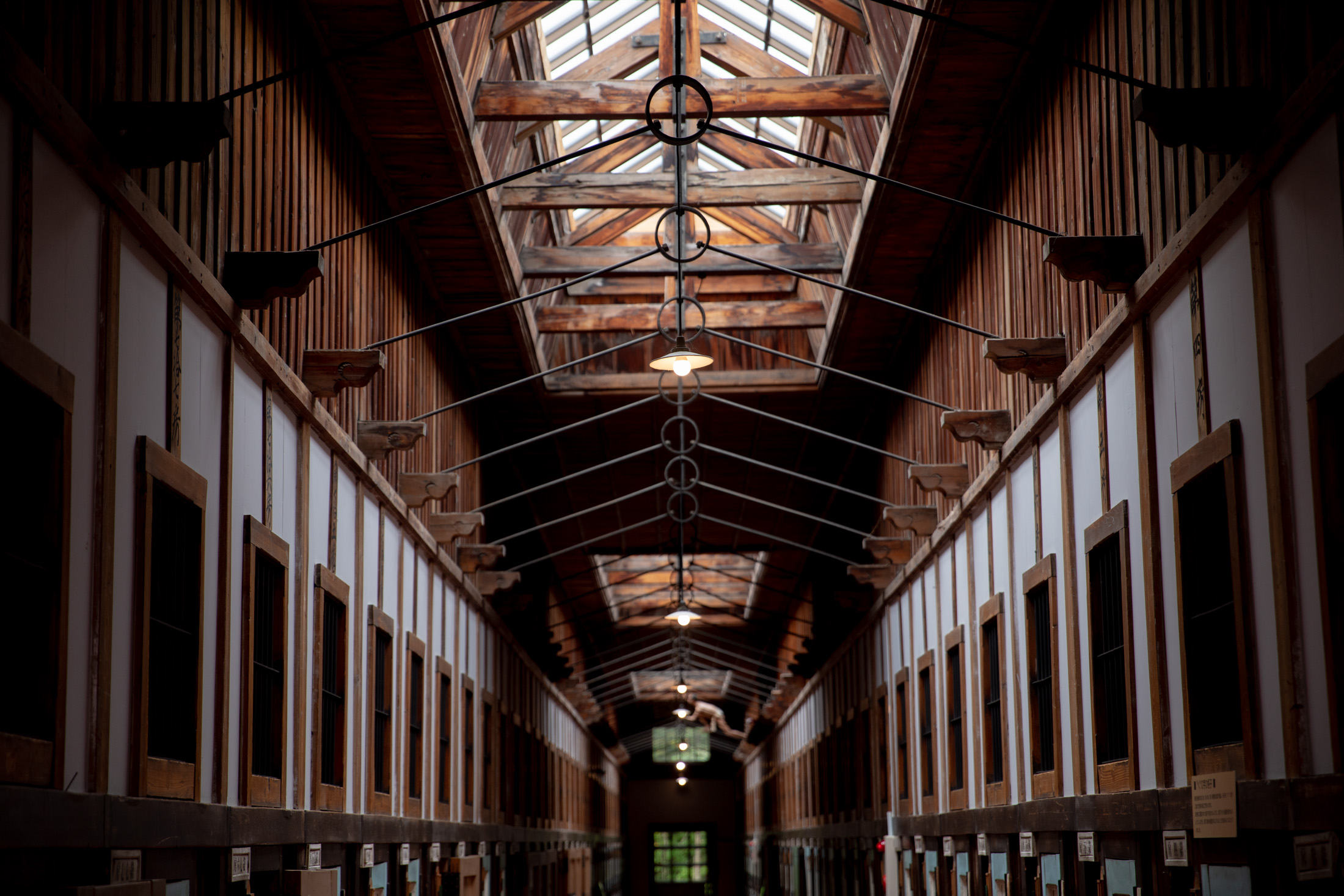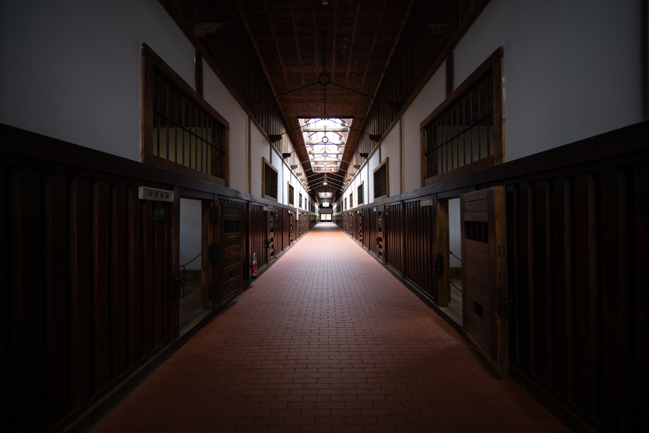 Symmetrical view down Abashiri Prison Museum cellblock corridor, lined with wooden barred doors and lit by a long skylight.