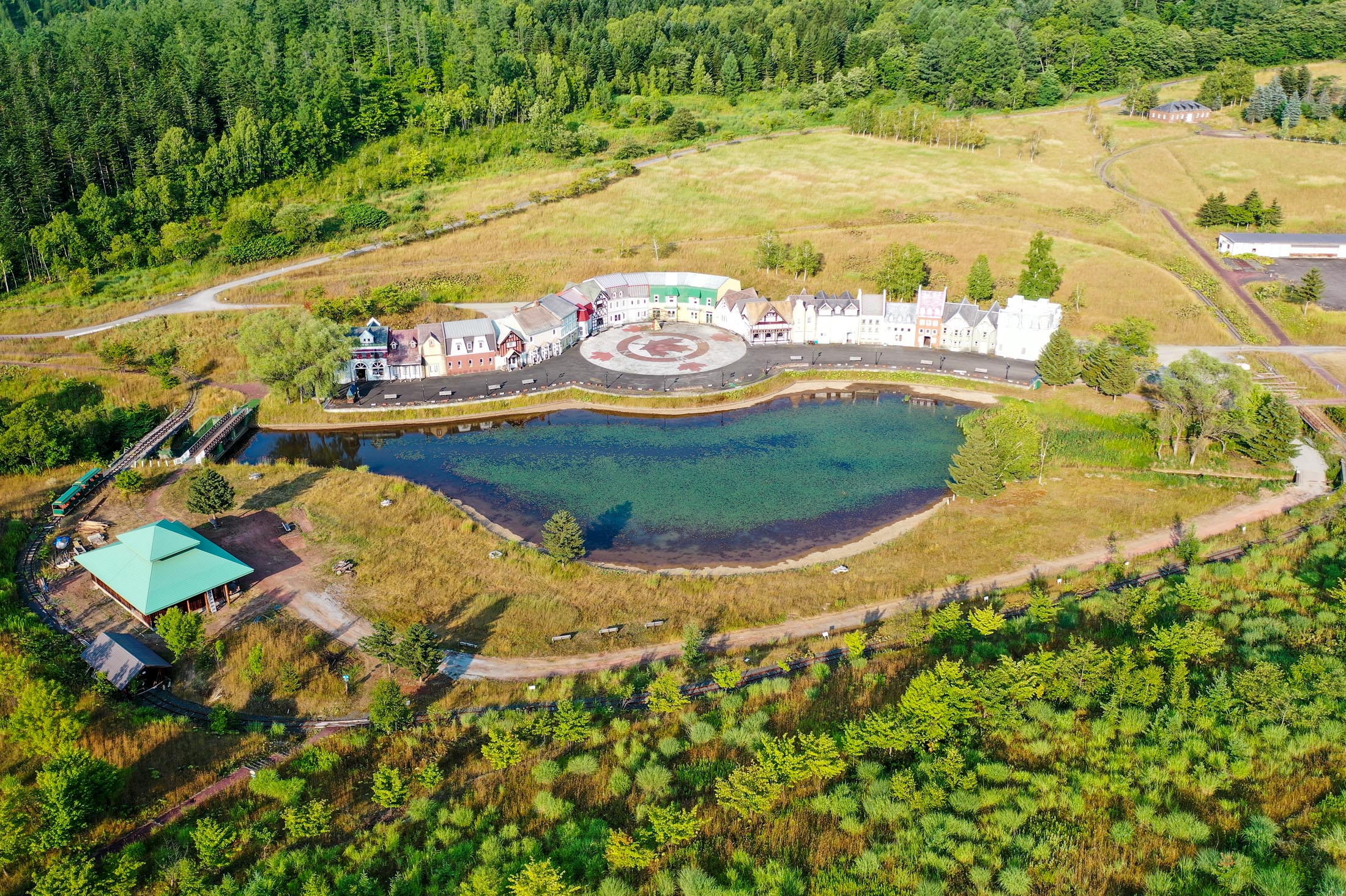 Aerial view of a Canadian-themed architectural landmark in Japan featuring a large maple leaf design.