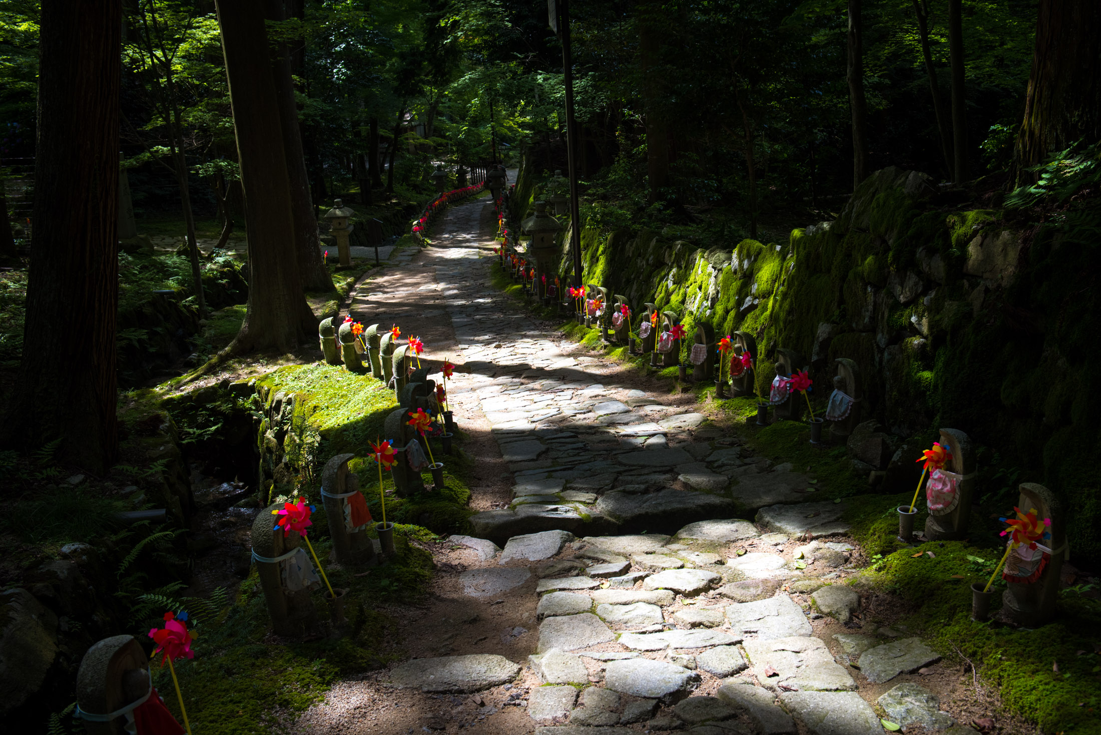 Moss-covered path at Kongōrin-ji Temple in Japan, lined with stone statues and red pinwheels beneath sunlit forest trees.