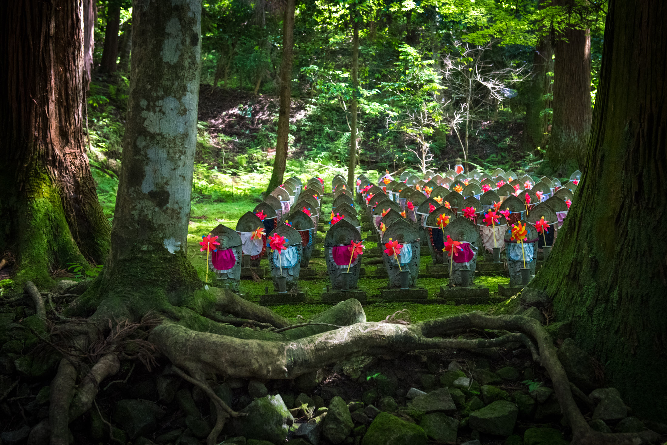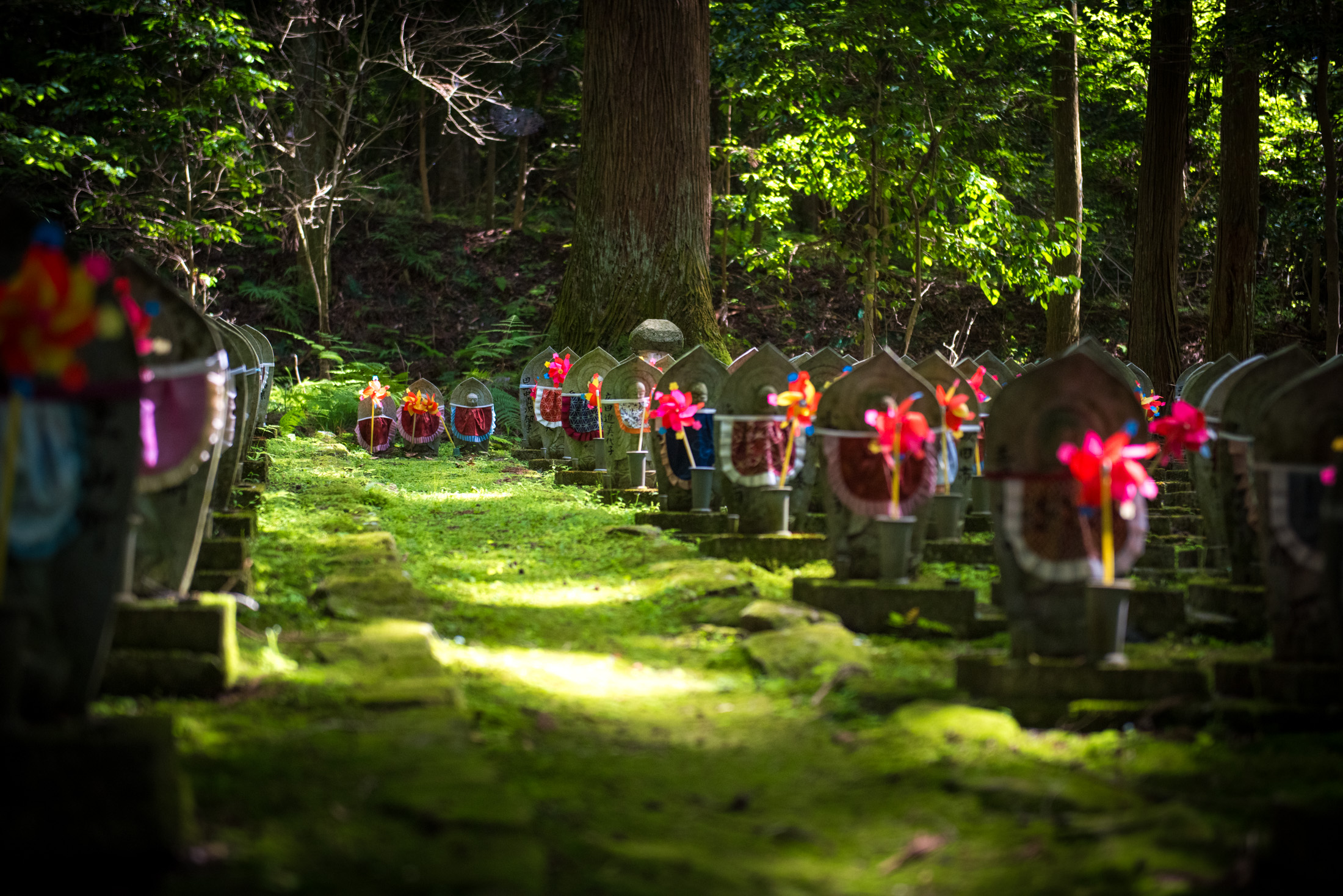 Moss-covered Jizō statues with colorful bibs sit in dappled shade at Kongōrin-ji Temple, Japan.