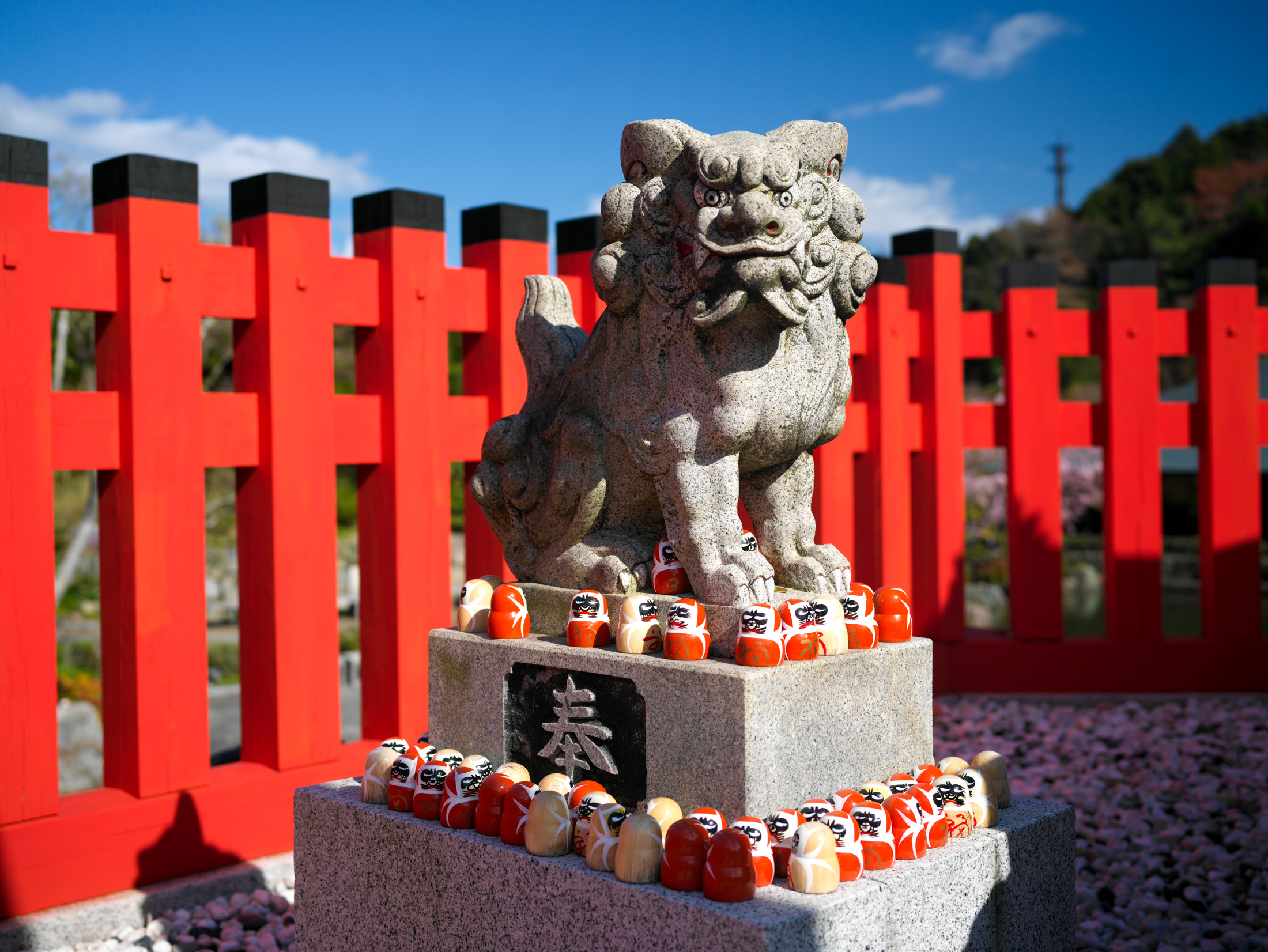 Guardian Lion Statue with Offerings at Japanese Temple