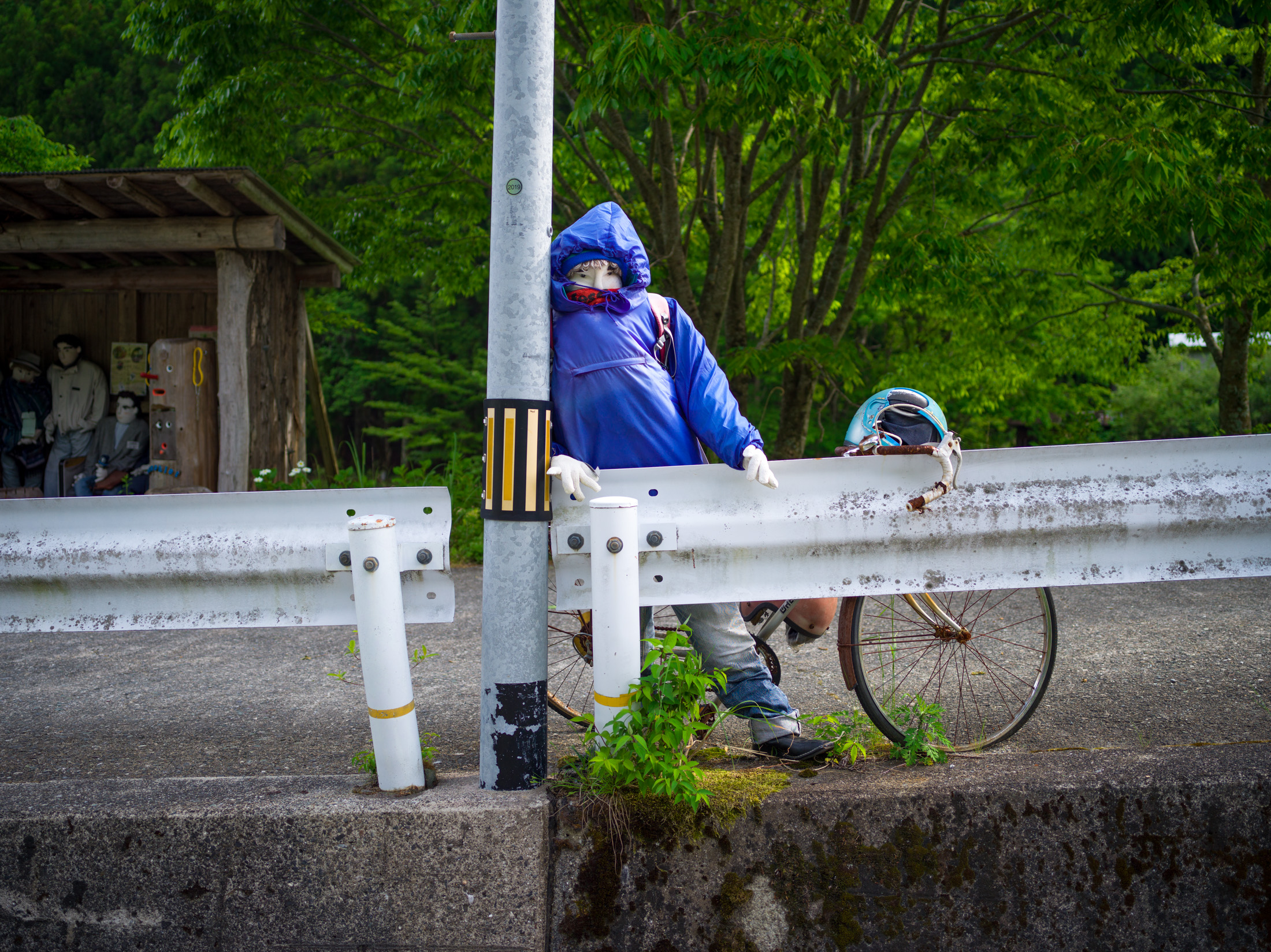 A pensive cyclist pauses amid the serene tranquility of Nagoro, a remote Japanese village.