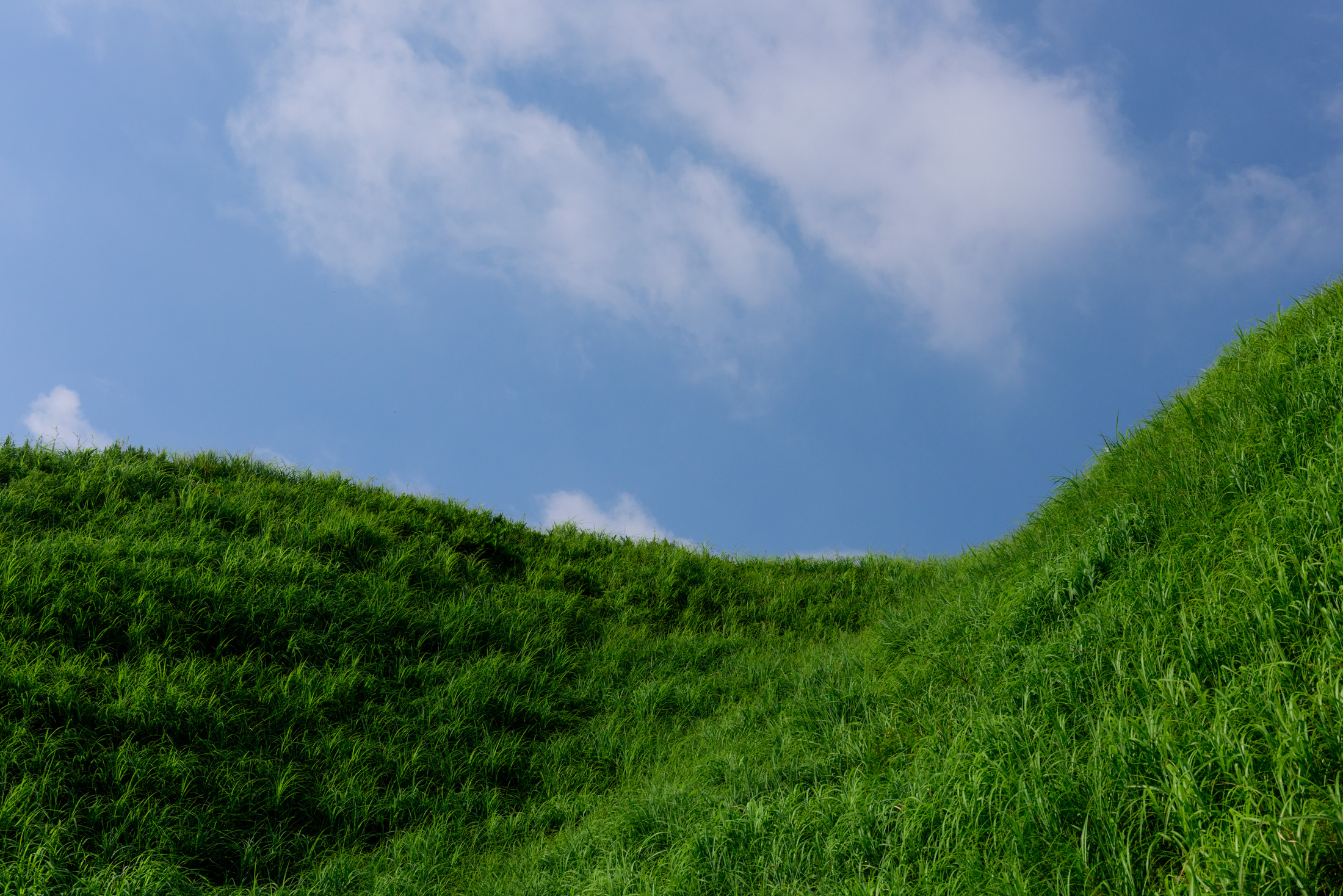 Tranquil landscape of lush green hills with winding road through Aso Mountain Range.
