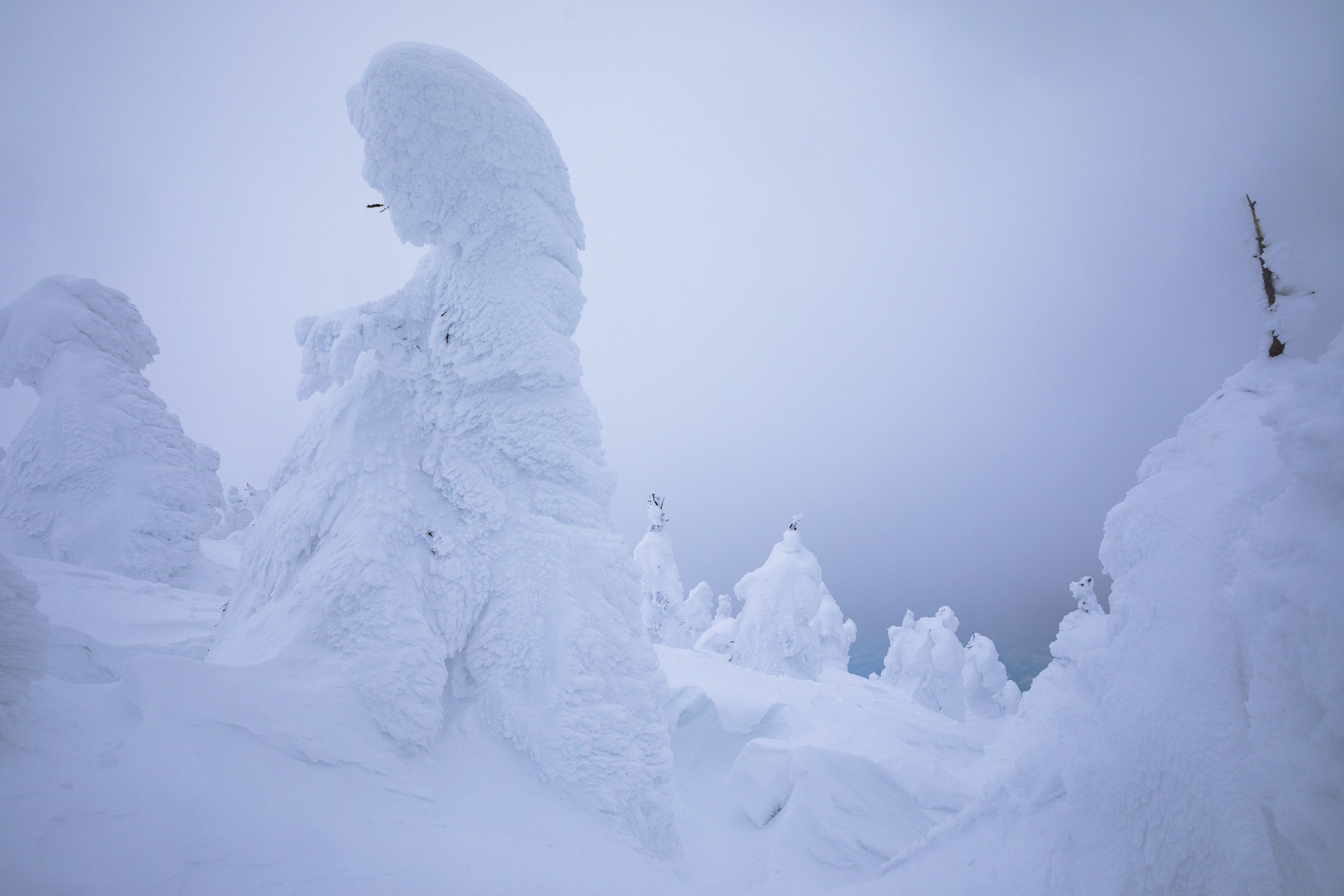 Eerie snow-sculpted sentinels guarding a wintry wonderland in Japans remote Zao region.