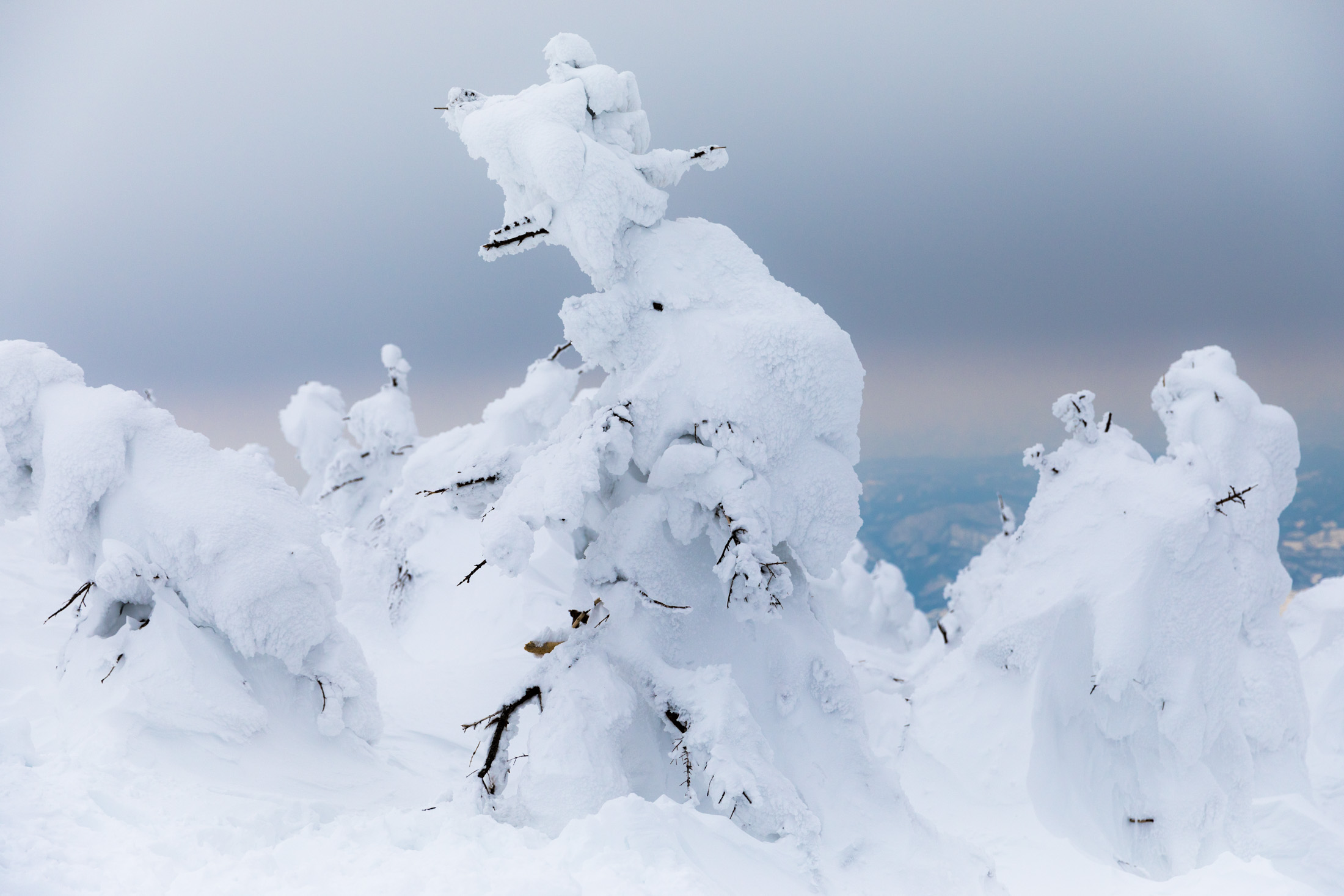 Twisted snow-capped trees transform into ghostly snow monsters against snowy Japanese mountains.