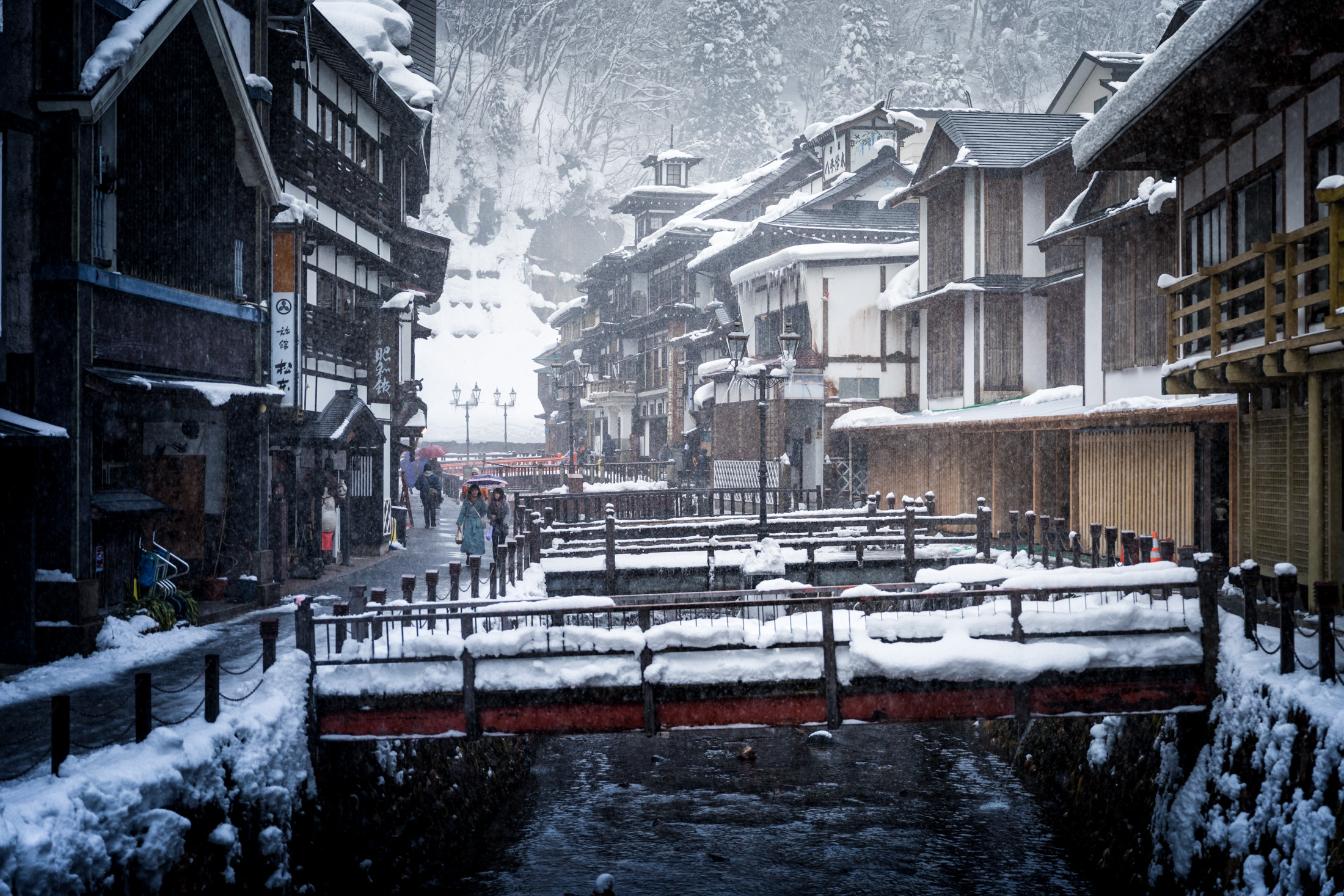 Experience the winter charm of Ginzan Onsens traditional architecture and snow-covered canal.