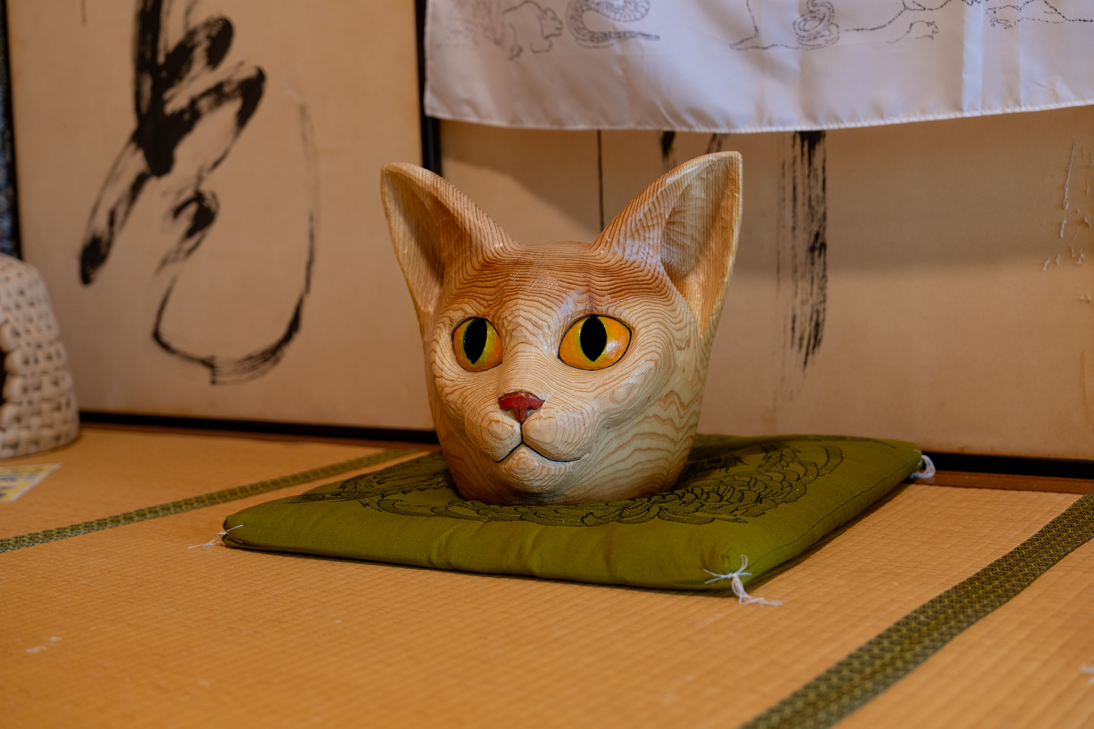 入口には数十体の木彫りの猫が番をしています。凛々しい顔のものもあれば、いたずらっぽい表情のものもあり、すべての猫がじっとあなたを見つめます。驚きが落ち着くと、この場所が単なるキッチュな飾りではなく、400年以上の歴史を持つ本格的な禅寺であり、猫への深い愛情が表現されていることがわかります。